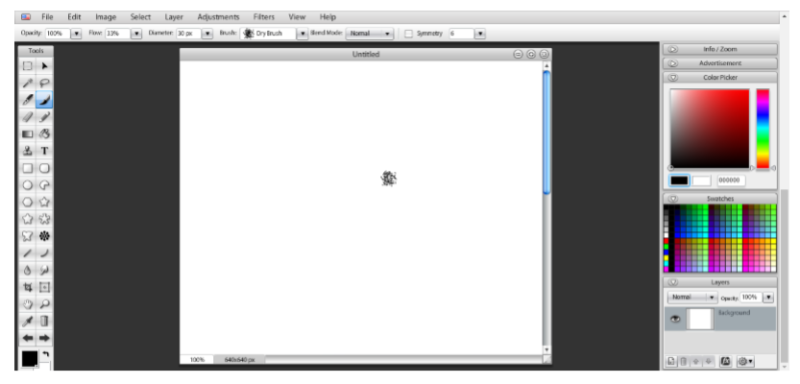 Je kan het scherm van Sumo Paint in vele opzichten vergelijken met dat van My.Sketchup. Je werkt om te beginnen in je browser (Google Chrome), dus let op met acties zoals bijvoorbeeld in- en uitzoomen.